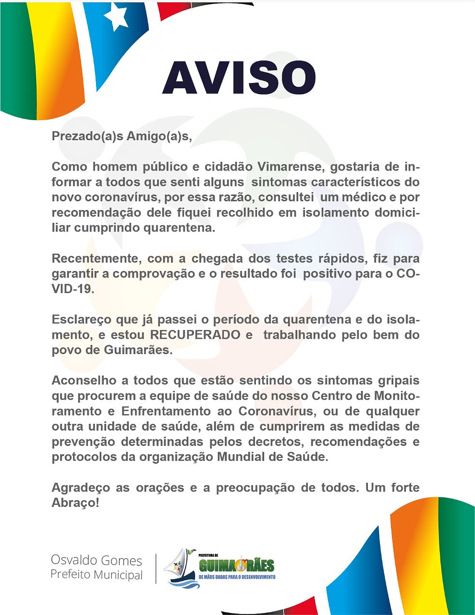 O prefeito de Guimarães, professor Osvaldo Gomes, através da sua assessoria de comunicação vem a público informar que testou positivo para a COVID-!9. Abaixo o teor do comunicado.